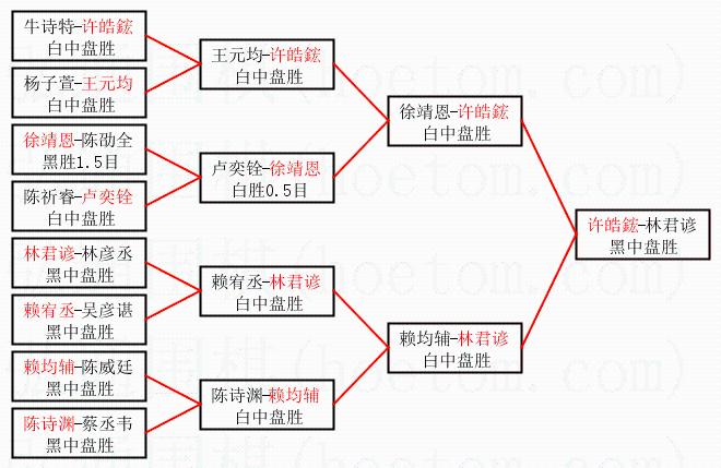 1.许皓鋐获得冠军,林君谚获得亚军。决赛比分:许皓鋐4:1林君谚。棋局: