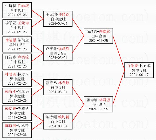 1.许皓鋐获得冠军,林君谚获得亚军。决赛比分:许皓鋐4:1林君谚。棋局: