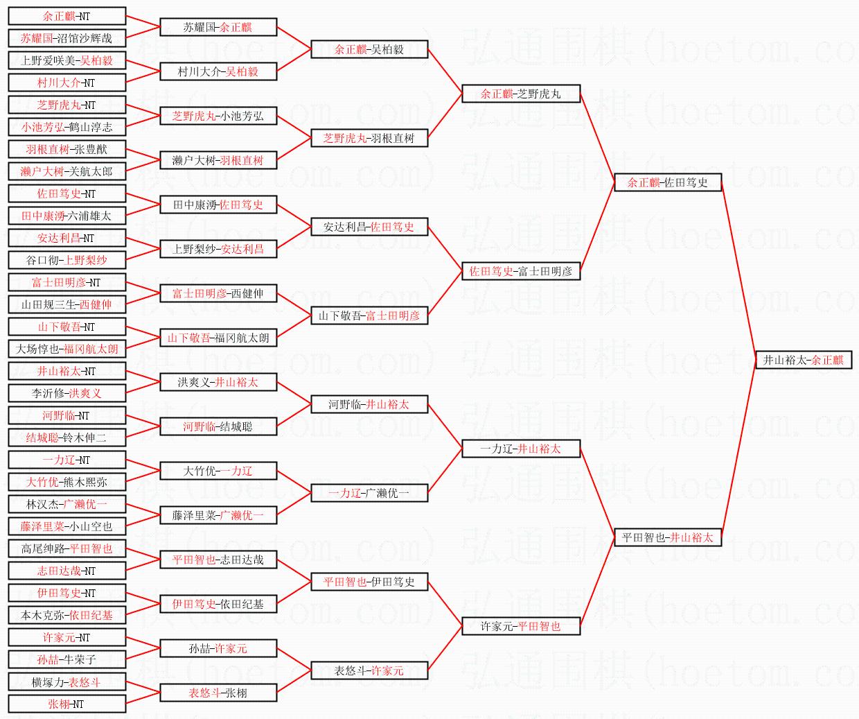 1.余正麒获得冠军,井山裕太获得亚军。决赛比分:余正麒1:0井山裕太。棋局:
