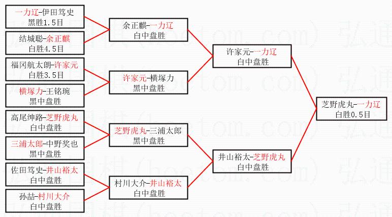 1.一力辽获得冠军,芝野虎丸获得亚军。决赛比分:一力辽1:0芝野虎丸。棋局: