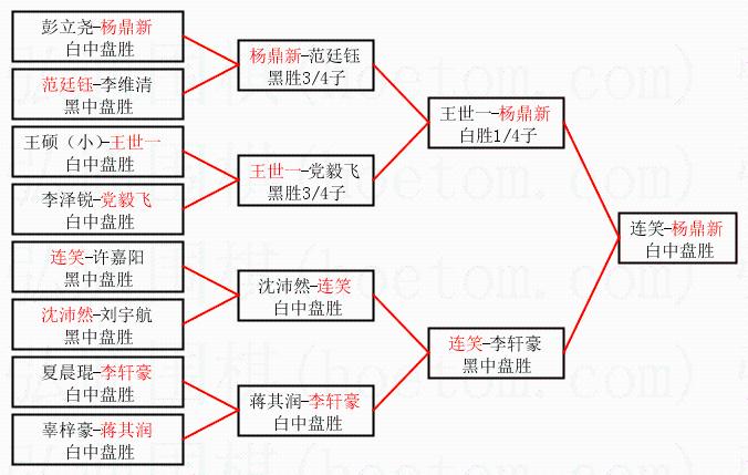 1.杨鼎新获得冠军,连笑获得亚军。决赛比分:杨鼎新1:0连笑。棋局: