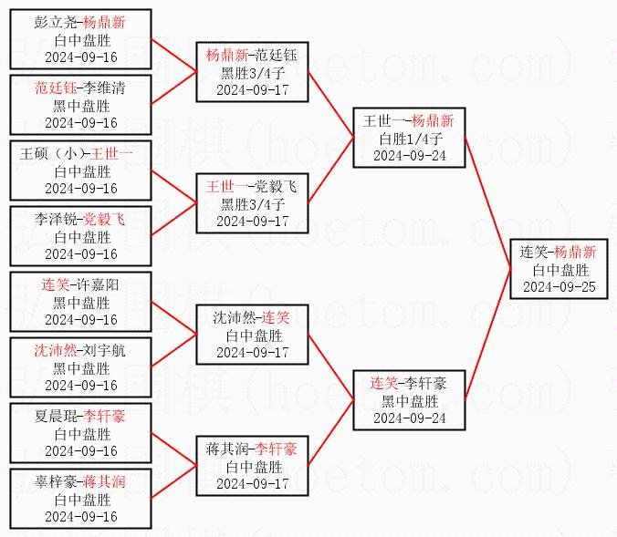 1.杨鼎新获得冠军,连笑获得亚军。决赛比分:杨鼎新1:0连笑。棋局: