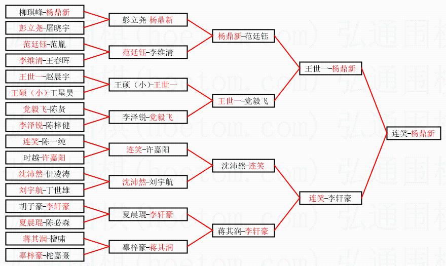 1.杨鼎新获得冠军,连笑获得亚军。决赛比分:杨鼎新1:0连笑。棋局: