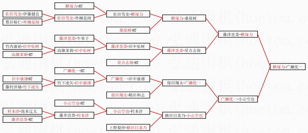 1.横塚力获得冠军,广濑优一获得亚军。决赛比分:横塚力1:0广濑优一。棋局: