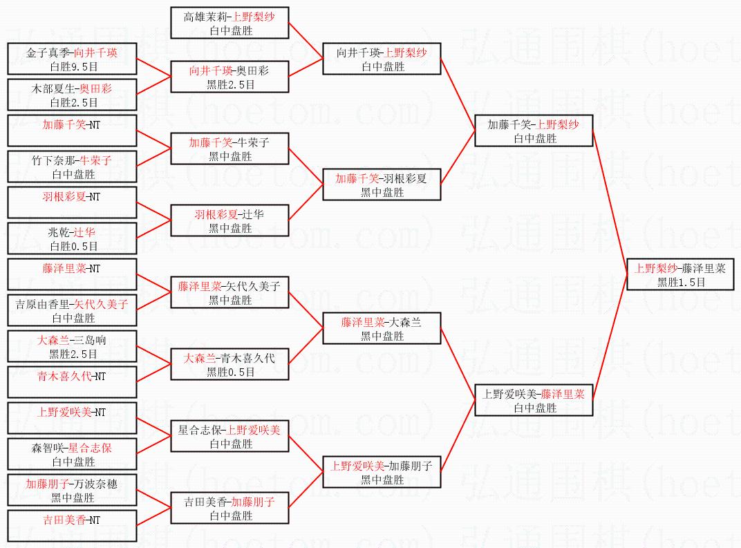 1.上野梨纱获得冠军,藤泽里菜获得亚军。决赛比分:上野梨纱1:0藤泽里菜。棋局: