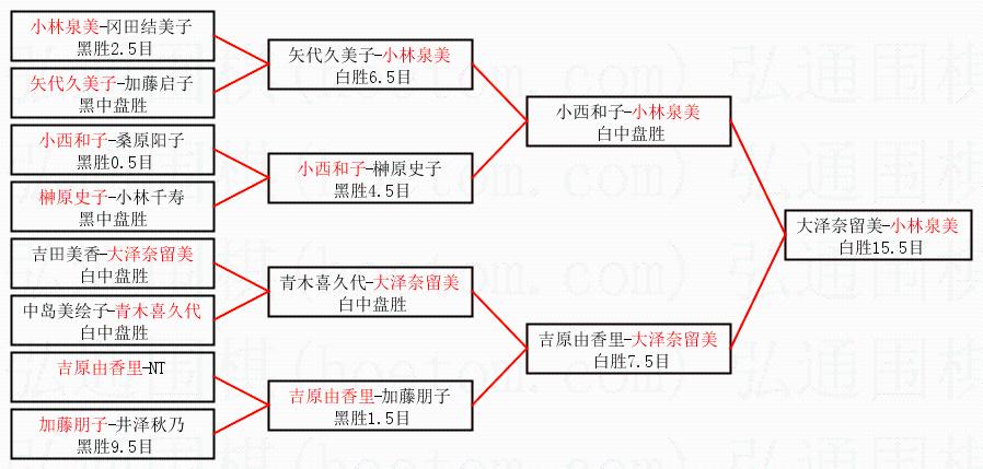 1.小林泉美获得冠军,大泽奈留美获得亚军。决赛比分:小林泉美1:0大泽奈留美。棋局: