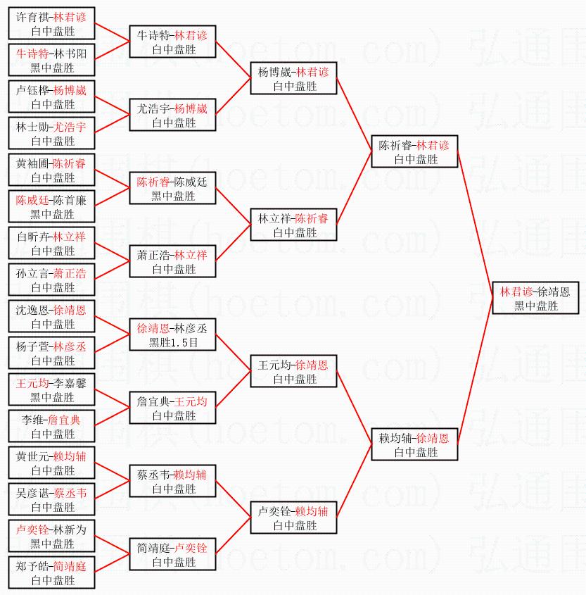 1.林君谚获得冠军,徐靖恩获得亚军。决赛比分:林君谚2:1徐靖恩。棋局: