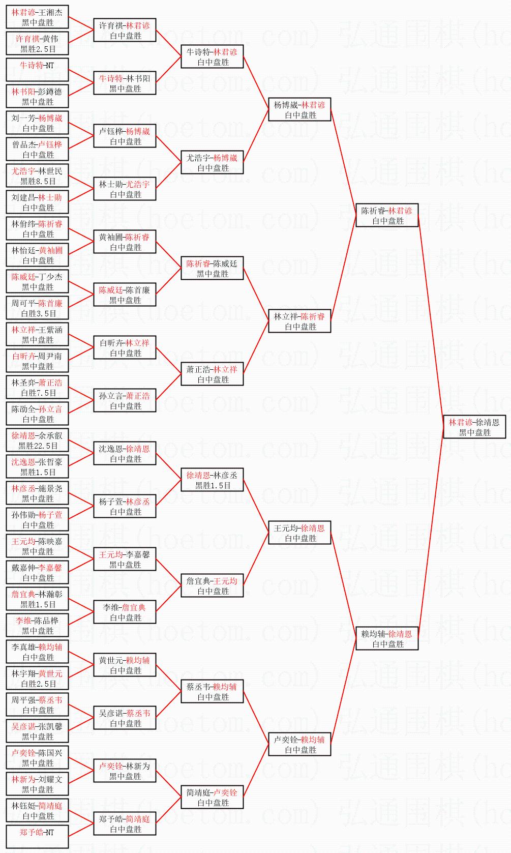 1.林君谚获得冠军,徐靖恩获得亚军。决赛比分:林君谚2:1徐靖恩。棋局: