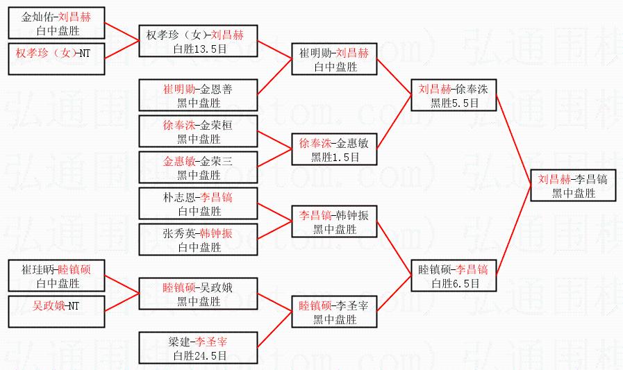 1.刘昌赫获得冠军,李昌镐获得亚军。决赛比分:刘昌赫1:0李昌镐。棋局: