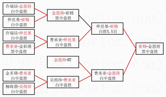 1.崔精获得冠军,金恩持获得亚军。决赛比分:崔精2:1金恩持。棋局: