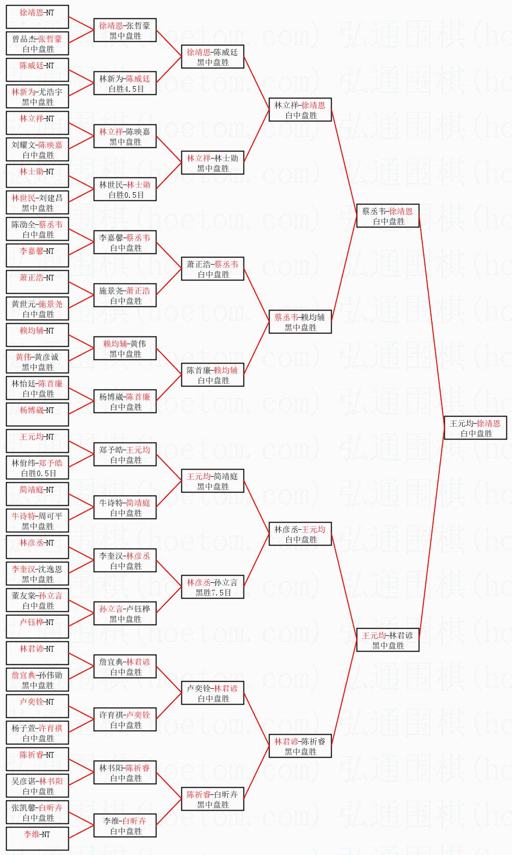 1.徐靖恩获得冠军,王元均获得亚军。决赛比分:徐靖恩2:0王元均。棋局: