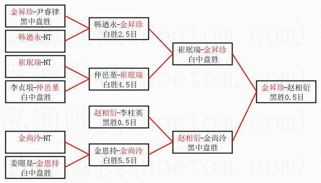 1.金昇珍获得冠军,赵相衍获得亚军。决赛比分:金昇珍1:0赵相衍。棋局: