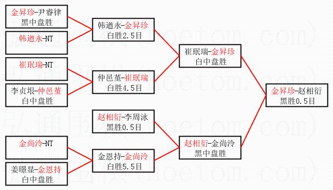 1.金昇珍获得冠军,赵相衍获得亚军。决赛比分:金昇珍1:0赵相衍。棋局: