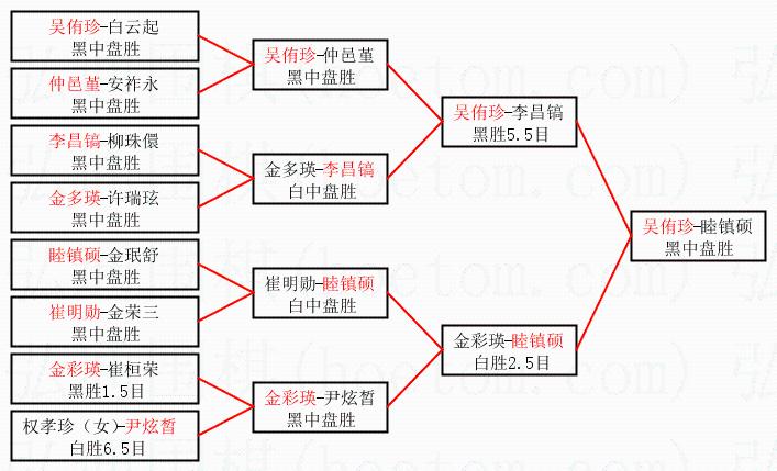 | 2.上半区半决赛吴侑珍获胜, 比分:吴侑珍 1:0 李昌镐。棋局: | ||