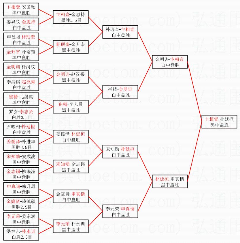 1.卞相壹获得冠军,朴廷桓获得亚军。决赛比分:卞相壹2:1朴廷桓。棋局:
