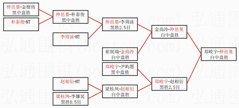 1.仲邑堇获得冠军,郑峻宇获得亚军。决赛比分:仲邑堇1:0郑峻宇。棋局: