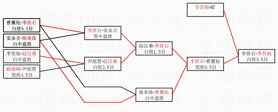 | 1.李昌镐获得冠军,李世石获得亚军。决赛比分:李昌镐3:2李世石。棋局: | ||