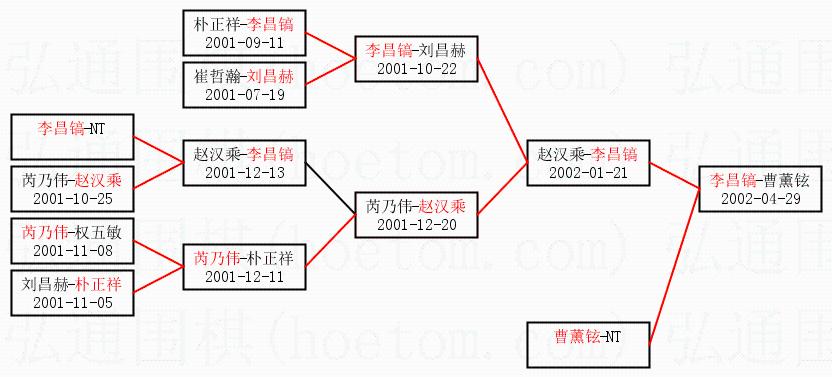 1.李昌镐获得冠军,曹薰铉获得亚军。决赛比分:李昌镐3:1曹薰铉。棋局: