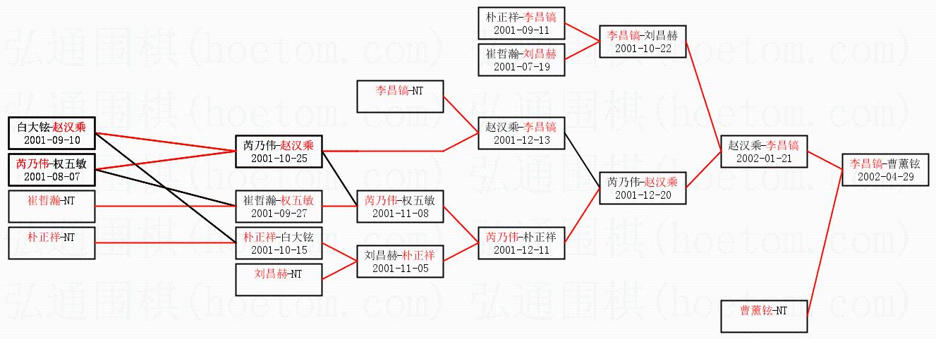 1.李昌镐获得冠军,曹薰铉获得亚军。决赛比分:李昌镐3:1曹薰铉。棋局: