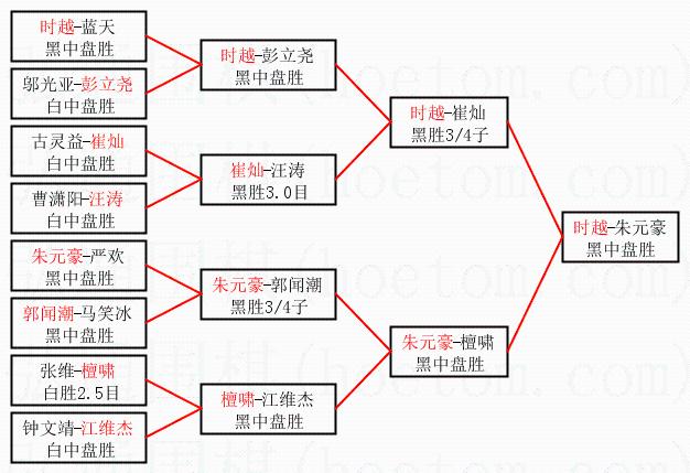 1.时越获得冠军,朱元豪获得亚军。决赛比分:时越2:0朱元豪。棋局: