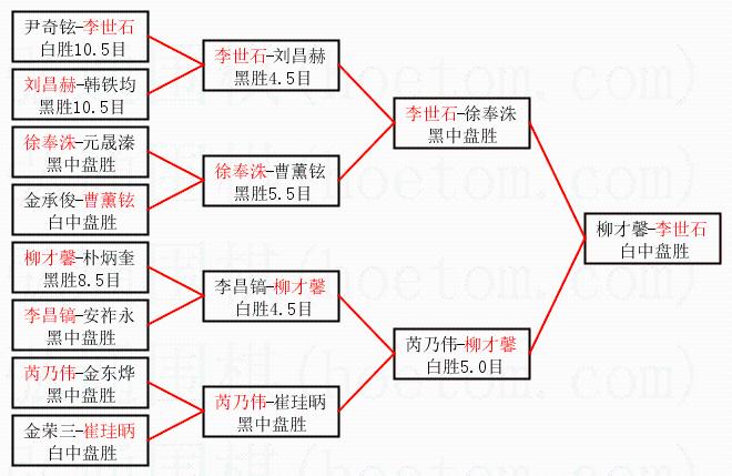 | 1.李世石获得冠军,柳才馨获得亚军。决赛比分:李世石3:0柳才馨。棋局: | ||