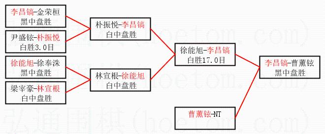 1.李昌镐获得冠军,曹薰铉获得亚军。决赛比分:李昌镐3:0曹薰铉。棋局: