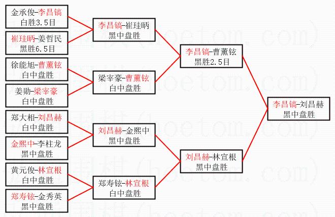 | 1.李昌镐获得冠军,刘昌赫获得亚军。决赛比分:李昌镐3:0刘昌赫。棋局: | ||