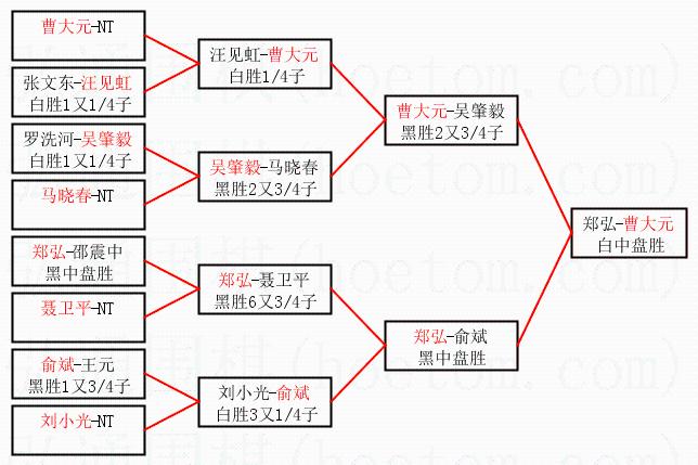 1.曹大元获得冠军,郑弘获得亚军。决赛比分:曹大元1:0郑弘。棋局:
