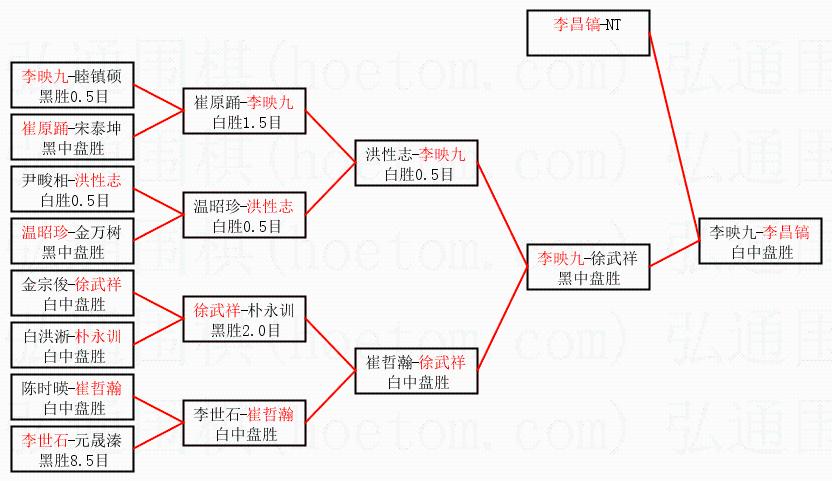 1.李昌镐获得冠军,李映九获得亚军。决赛比分:李昌镐3:0李映九。棋局: