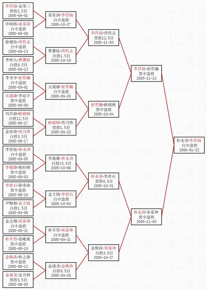 1.李昌镐获得冠军,朴永训获得亚军。决赛比分:李昌镐2:1朴永训。棋局: