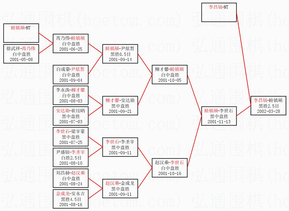 1.李昌镐获得冠军,睦镇硕获得亚军。决赛比分:李昌镐3:2睦镇硕。棋局: