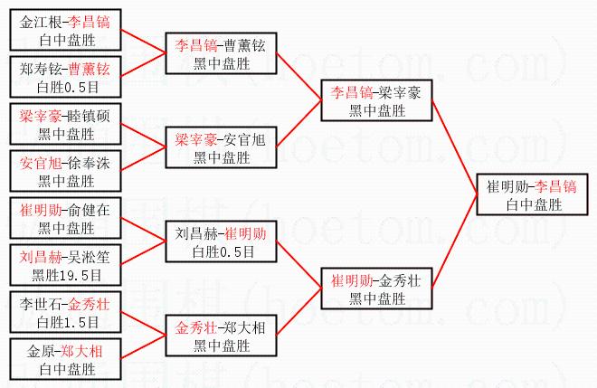 | 1.李昌镐获得冠军,崔明勋获得亚军。决赛比分:李昌镐3:0崔明勋。棋局: | ||