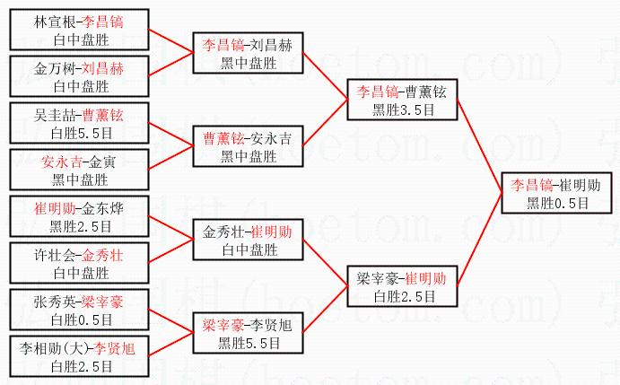 | 1.李昌镐获得冠军,崔明勋获得亚军。决赛比分:李昌镐3:0崔明勋。棋局: | ||