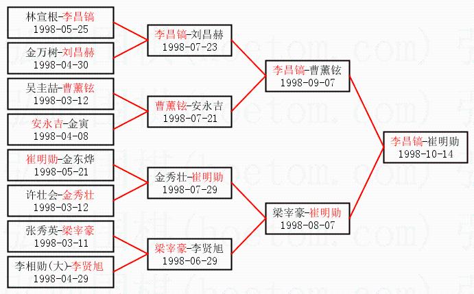 | 1.李昌镐获得冠军,崔明勋获得亚军。决赛比分:李昌镐3:0崔明勋。棋局: | ||