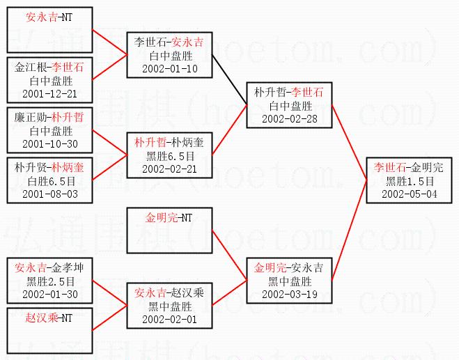 | 1.李世石获得冠军,金明完获得亚军。决赛比分:李世石2:1金明完。棋局: | ||