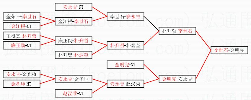| 1.李世石获得冠军,金明完获得亚军。决赛比分:李世石2:1金明完。棋局: | ||