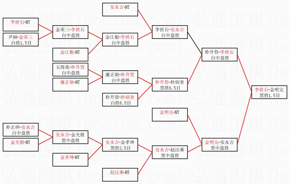 | 1.李世石获得冠军,金明完获得亚军。决赛比分:李世石2:1金明完。棋局: | ||