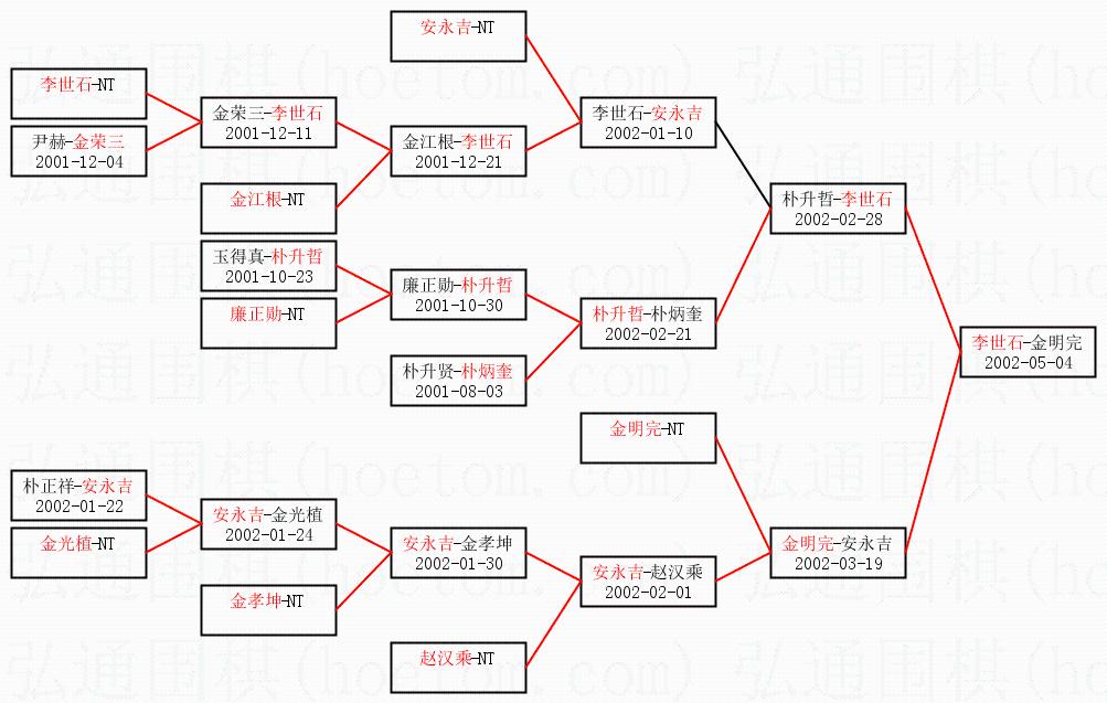 | 1.李世石获得冠军,金明完获得亚军。决赛比分:李世石2:1金明完。棋局: | ||