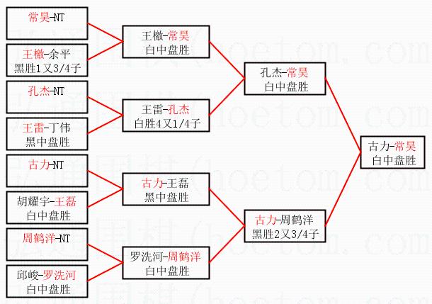 1.常昊获得冠军,古力获得亚军。决赛比分:常昊1:0古力。棋局:
