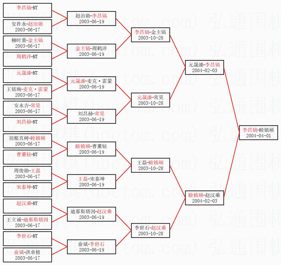 | 1.李昌镐获得冠军,睦镇硕获得亚军。决赛比分:李昌镐3:1睦镇硕。棋局: | ||