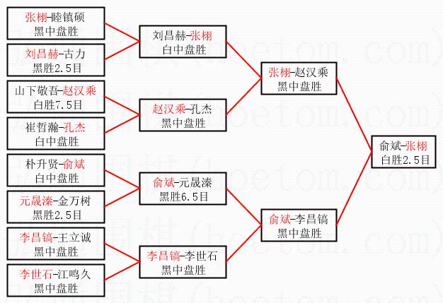 | 3.下半区半决赛俞斌获胜,比分:俞斌1:0李昌镐。棋局: | ||