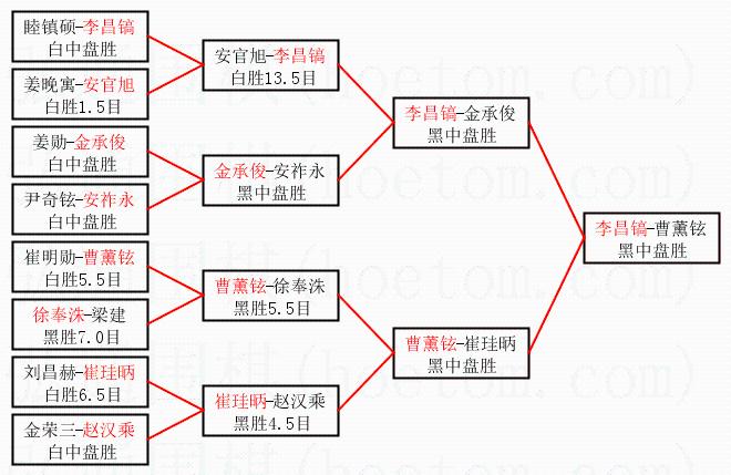 | 1.李昌镐获得冠军,曹薰铉获得亚军。决赛比分:李昌镐3:2曹薰铉。棋局: | ||