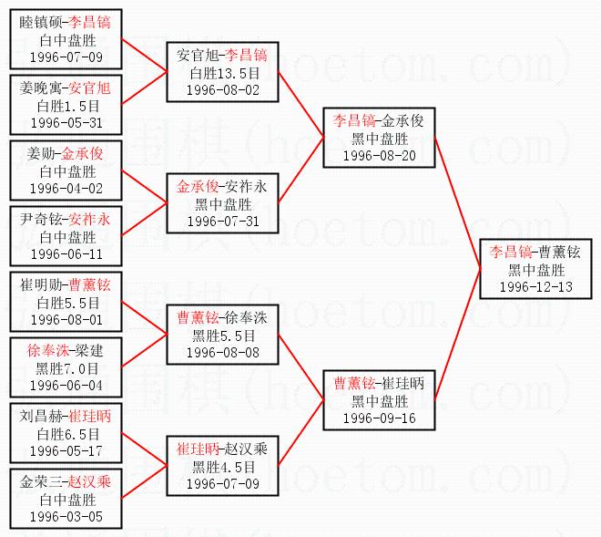 1.李昌镐获得冠军,曹薰铉获得亚军。决赛比分:李昌镐3:2曹薰铉。棋局: