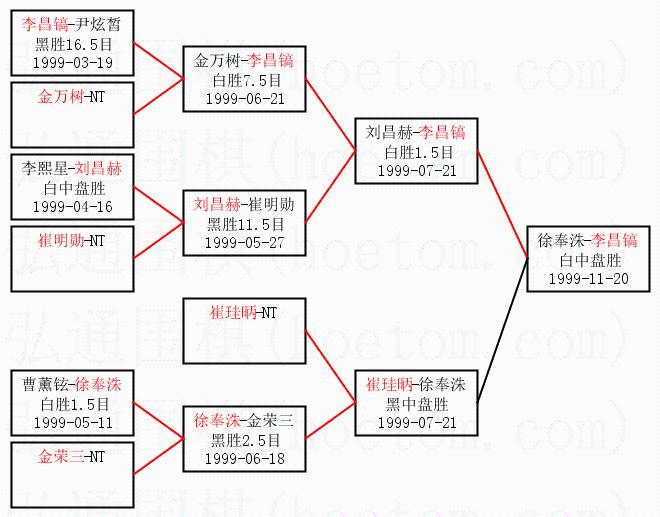 1.李昌镐获得冠军,徐奉洙获得亚军。决赛比分:李昌镐3:0徐奉洙。棋局: