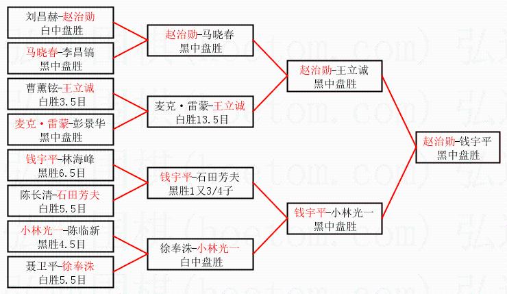 | 1.赵治勋获得冠军,钱宇平获得亚军。决赛比分:赵治勋1:0钱宇平。棋局: | ||