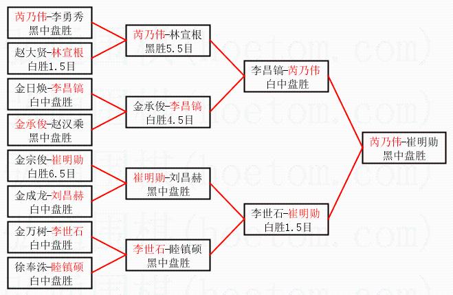 | 3.下半区半决赛崔明勋获胜,比分:崔明勋1:0李世石。棋局: | ||