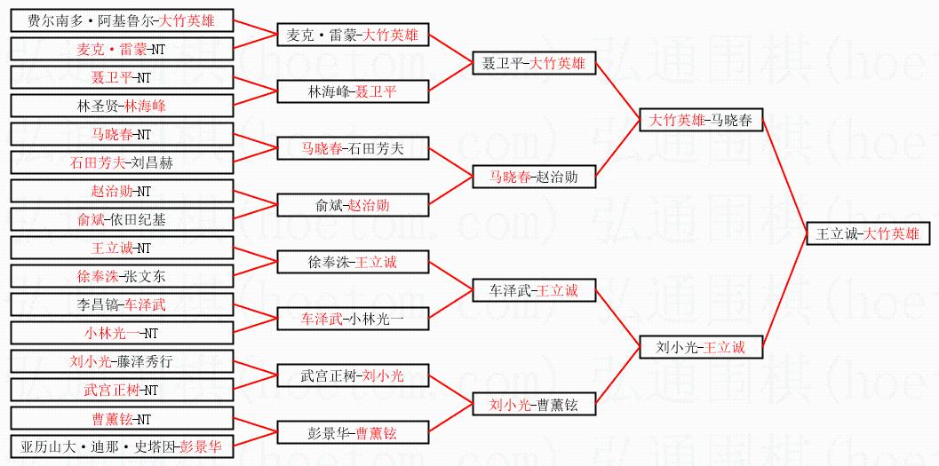 1.大竹英雄获得冠军,王立诚获得亚军。决赛比分:大竹英雄1:0王立诚。棋局: