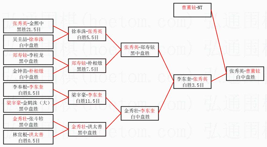 1.曹薰铉获得冠军,张秀英获得亚军。决赛比分:曹薰铉3:0张秀英。棋局: