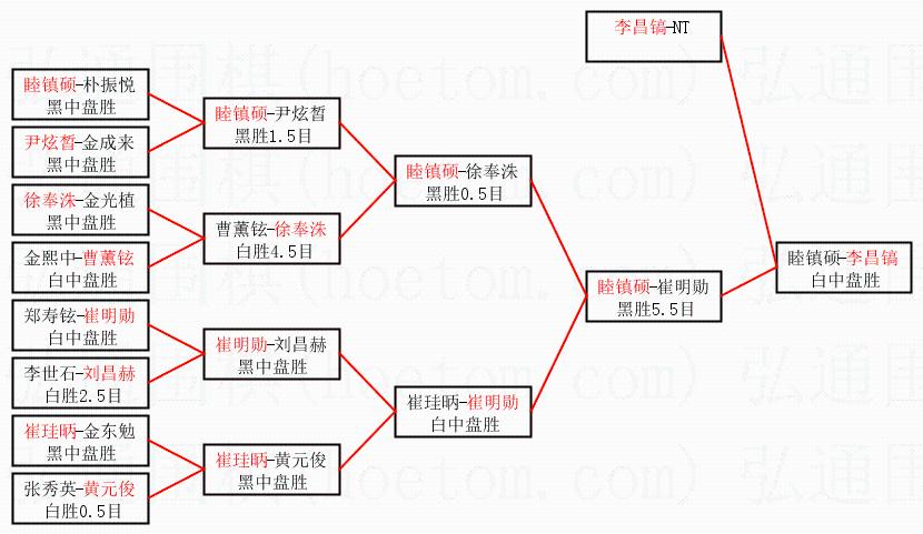 1.李昌镐获得冠军,睦镇硕获得亚军。决赛比分:李昌镐2:0睦镇硕。棋局:
