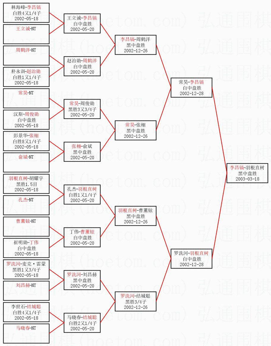 | 1.李昌镐获得冠军,羽根直树获得亚军。决赛比分:李昌镐2:0羽根直树。棋局: | ||